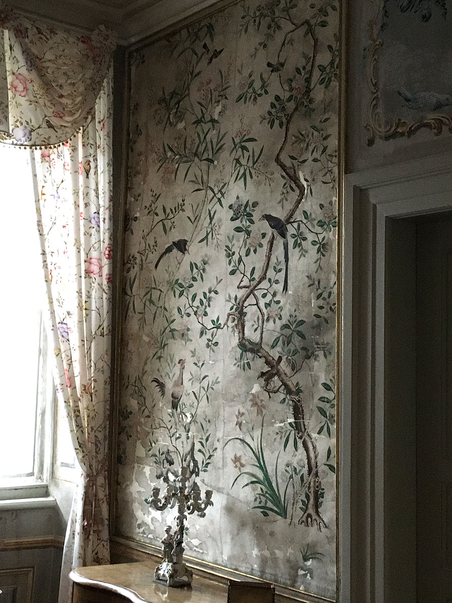 Wir durchstreiften nicht das Schloss in seiner Gänze, sondern bewunderten nur die goldgeprägten Ledertapeten (um 1720) – mit solchen Tapeten schmückte auch unser Kurfürst Carl Ludwig im 17. Jahrhundert sein Schloss Schwetzingen aus – sowie die beiden Chinoiserien, die Vogeltapete (um 1780) und die China-Tapete (1814). Die Räume des 19. Jahrhunderts selbst sind ziemlich vollgestellt, und man darf hoffen, dass die Restauratoren sich dabei auf ausreichende Inventare stützen konnten.