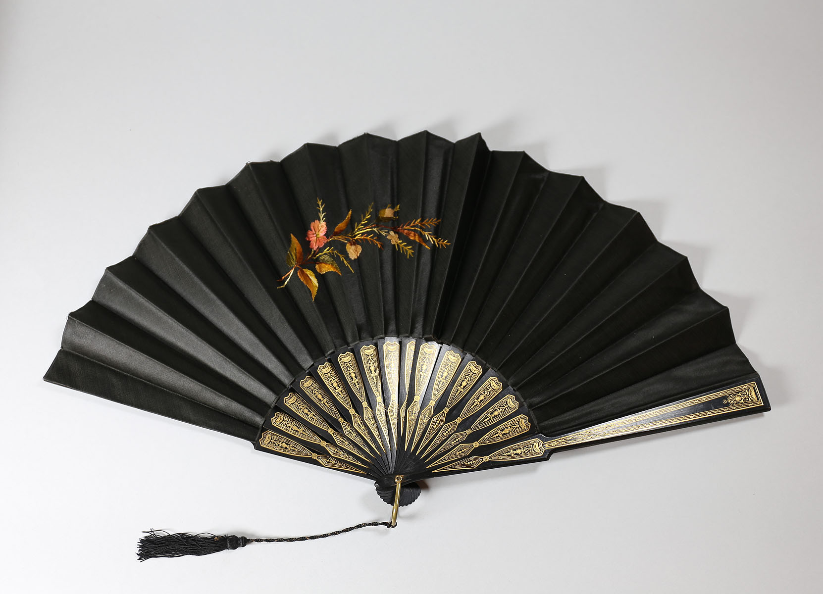 Der schwarze Seidenfächer ist mit Blumenmotiven bestickt und hat einen Holzgriff, der mit Metallornamenten verziert ist. Das kostbare Material lässt es erahnen: Solch ein Fächer ist nicht nur als Gebrauchsgegenstand gedacht, mit dem man sich an heißen Tagen Luft zufächelt. Das Utensil war in früheren Jahrhunderten vielmehr ein modisches Accessoire und ein Statussymbol für die elegante Dame. Aber auch der Anbahnung von Kontakten konnte ein Fächer sehr dienlich sein. Die Dame verbarg ihr Gesicht kokett hinter dem Fächerblatt und ließ nur ihre Augen sprechen. Oder sie ließ das kostbare Stück zu Boden fallen in der Hoffnung, ein Kavalier möge es aufheben und ihr reichen.