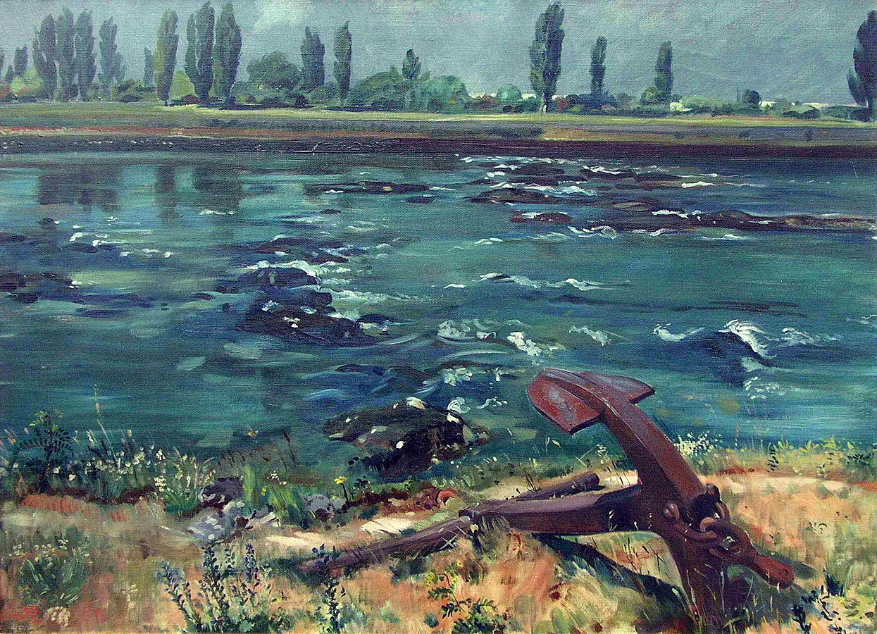 Hermann Burte (eigentlich Strübe), Anker am Rhein, Öl auf Leinwand, 1934. Der v.a. als Dichter im Dritten Reich geschätzte Hermann Burte war auch Maler. Die Perspektive zeigt den Blick von Baden über den Rhein ins Elsass, das 1918 wieder von Deutschland an Frankreich abgetreten werden musste und doch aus Burtes Sicht zur „gemeinsamen alemannischen Heimat“ gehörte. Sammlung Dreiländermuseum (BKBu 111)