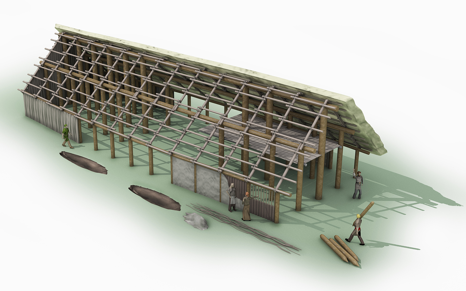 Rekonstruktion eines linearbandkeramischen Langhauses. Bild: M. Steffen, Landesamt für Denkmalpflege im Regierungspräsidium Stuttgart