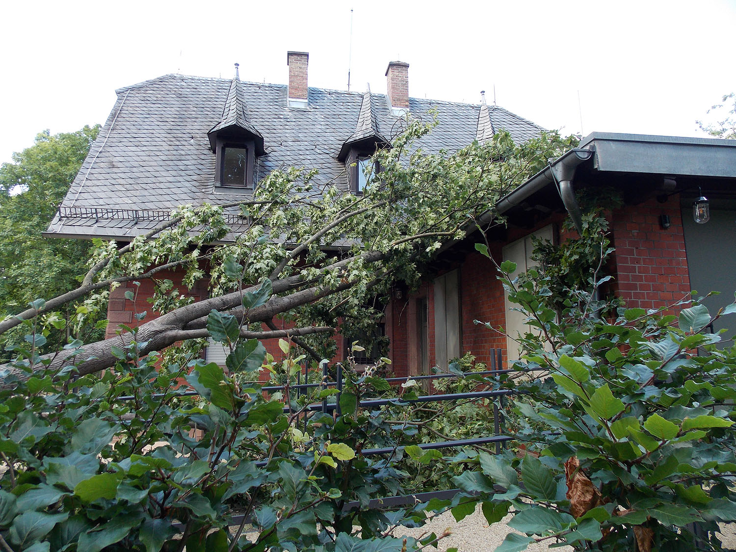 Frühsommerliche Gewitter und Starkregen in ganz Baden-Württemberg sorgten für viele Schäden – und auch die Umgebung der Großherzoglichen Grabkapelle blieb nicht verschont. Am Montagmorgen stellten Spaziergänger fest, dass große Äste abgebrochen waren. Die Untersuchung ergab, dass Teil einer Baumkrone abgebrochen und in den Innenhof des Wächterhauses gestürzt ist. Christina Ebel, als Leiterin der Schlossverwaltung Bruchsal auch für die Großherzogliche Grabkapelle zuständig, erklärt: „Das Geländer der neuen Rampe für den barrierefreien Zugang wurde beschädigt. Schäden am Dach sind nicht zu erkennen – um das beurteilen zu können, müssen erst einmal die Äste entfernt werden.“ Außerdem liegt auf der freien Grünfläche eine zweite abgebrochene Baumkrone.