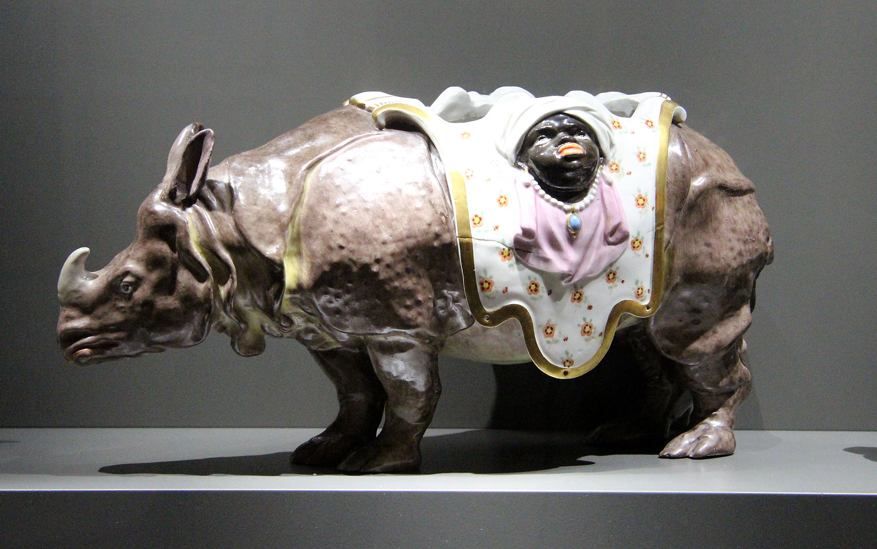 Um 1770 gab Kurfürst Carl Theodor ein außergewöhnliches Objekt in Auftrag: Hofbildhauer Peter Anton von Verschaffelt entwarf ein mächtiges Nashorn. Es handelt sich um eine Nachbildung des Panzernashorns „Miss Clara“, das durch eine – 17 Jahre dauernde – Ausstellungstour europaweit berühmt wurde. Clara war das erste Nashorn, das eine Schiffsfahrt nach Europa überstand und nach seiner Ankunft viele Jahre weiterlebte. Das Porzellan-Nashorn nutzte Kurfürst Carl Theodor ursprünglich als Sockel für eine Uhr: Der breite Rücken des Porzellantiers bot mit seiner Vertiefung genügend Platz. Er schätze das Schmuckstück so sehr, dass er damit sein Schlafzimmer dekorierte.