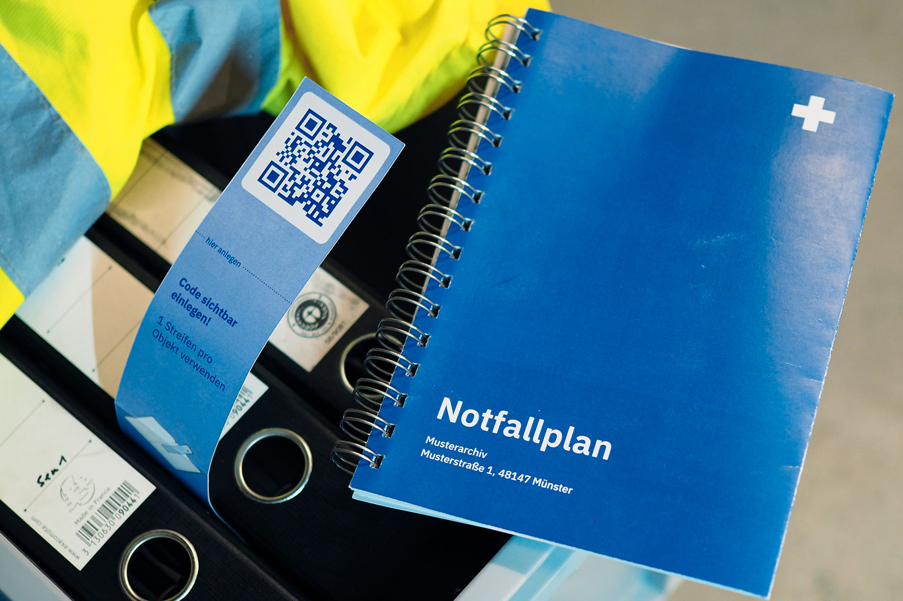„Die Ideen, die die beteiligten Studierenden entwickelt haben, haben uns total begeistert, sodass wir beschlossen haben, das Projekt tatsächlich zu verwirklichen“, erklärt die Historikerin. „Eine Förderung als Modellprojekt aus Bund-Länder-Mitteln der Koordinierungsstelle für die Erhaltung des schriftlichen Kulturguts (KEK) hat uns ermöglicht, die Studierenden offiziell mit der Umsetzung ihrer Konzepte zu beauftragen.“ Mit Hanna Breimann, Kim Janke, Tobias Moser und Annemarie Woeste haben sich vier junge Nachwuchsdesigner*innen gefunden, die sich neben ihrem Studium nun der Aufgabe widmen, das in Brauns Seminar entwickelte Notfall-Konzept zu verwirklichen. Unter anderem sollen Rollups mit kurzen Anweisungen zur Übersicht, ein umfangreicher Anleitungskatalog mit schnell verständlichen Illustrationen und kurzen Sätzen und außerdem ein visuelles Leitsystem entstehen. „Wir möchten den Einsatzkräften die Orientierung und Organisation vor Ort ermöglichen“, erklärt Woeste. „Durch Rollups, farbliche Teamkennzeichnungen und andere visuelle Hinweise, die den Beteiligten schnell verständlich machen, was wohin muss und wie genau sie vorgehen sollen“, ergänzt ihr Kommilitone Moser.