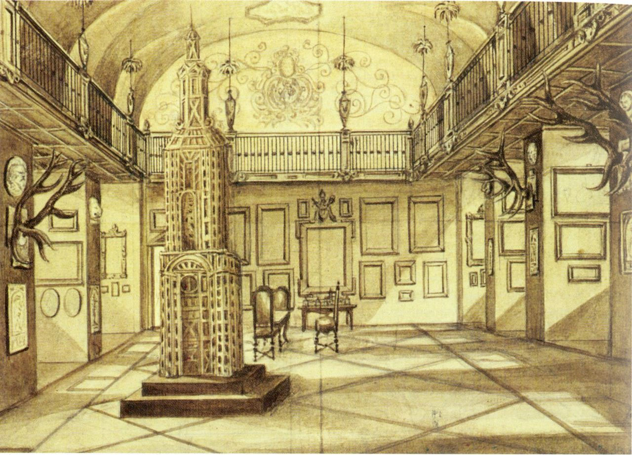 Bibliothekssaal um 1880 mit dem Modell des großen Glockenturms. Herkunft unbekannt, Wikimedia Commons /PD.