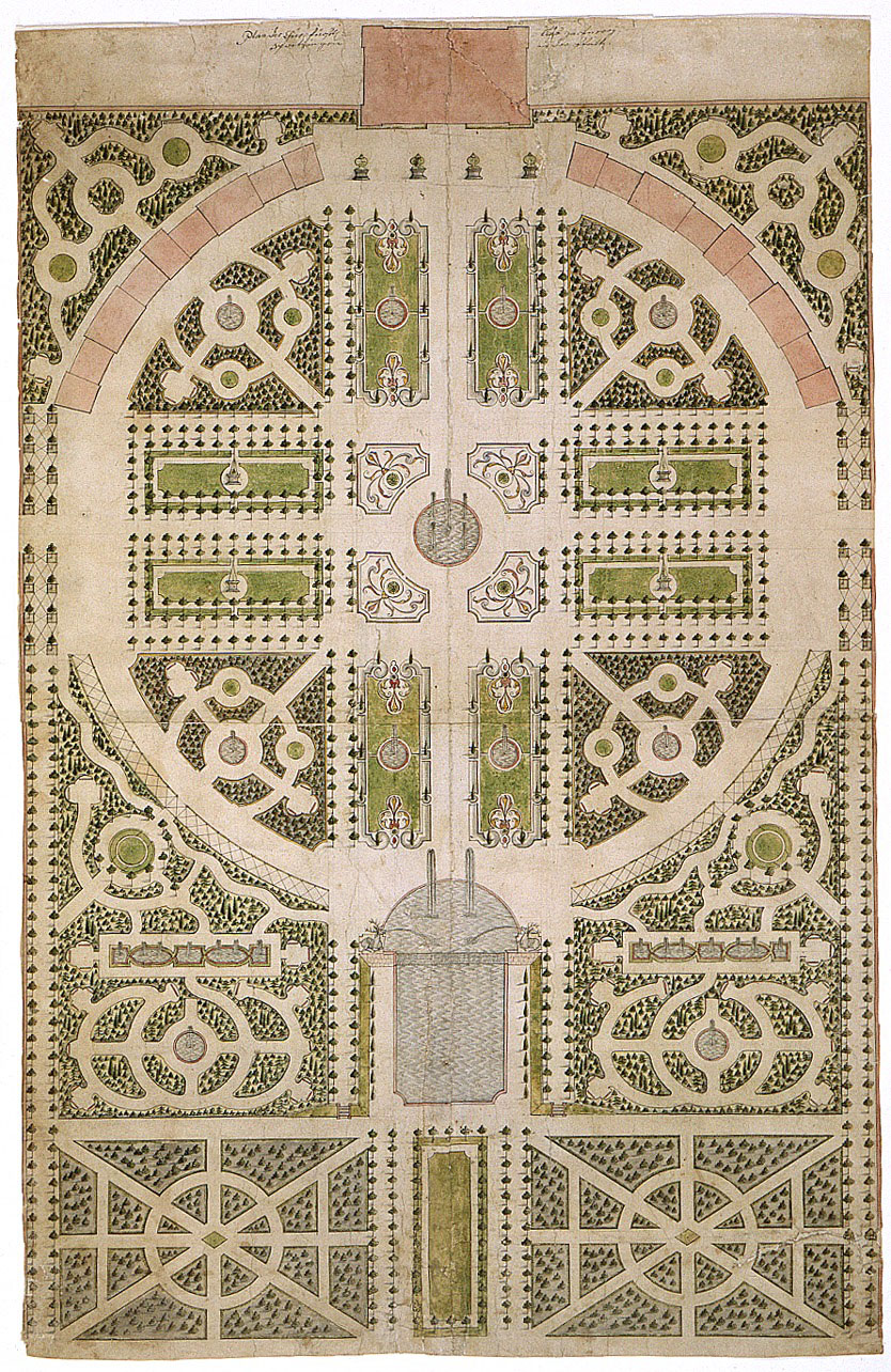 Noch im selben Jahr legte Petri einen Entwurf vor, den der Kurfürst sofort genehmigte. Petris Gartenplan zeigte die zeittypische Gestaltungsweise nach der Vorlage des französischen Gartentheoretikers Antoine Joseph Dezallier d´Argenville. Der geplanten Anlage lag ein Kreisparterre zugrunde. Im Osten wird es durch zwei Zirkelbauten umfasst, im Westen durch zwei in Viertelkreisen angelegte Laubengänge. Daran schließen rechtwinklig Heckenbereiche an. Die Mitte des Kreisparterres ist durch den Arionbrunnen mit beeindruckender Fontäne betont. Das gesamte Parterre wird von einem Kiesweg, Zirkus genannt, umfasst und kreuzförmig von einer Längs- und Querachse durchzogen. Petri kombiniert für den Zirkel verschiedene Parterreformen – auch die üblichen Rechtecke, die als „Parterres à l’angloise“ aus einer durch Zierwege gegliederten Rasenfläche bestehen.