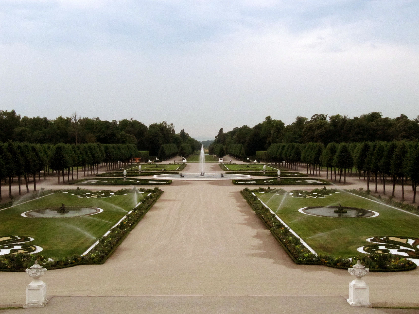 Schlossgarten Schwetzingen: Kreiparterre mit Arionbrunnen und Blick zur Kalmit