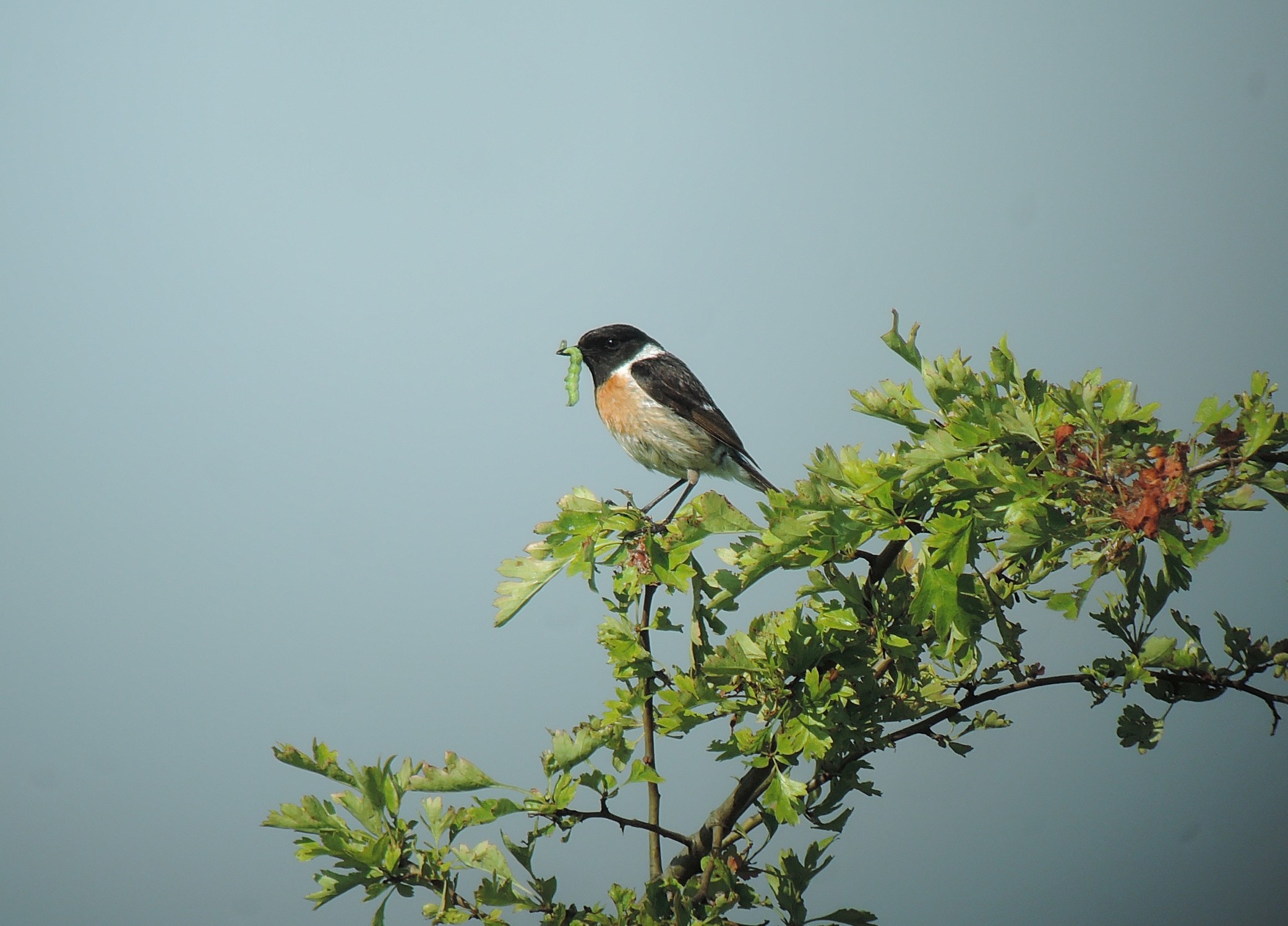 Ein Schwarzkehlchen hat eine Schmetterlingsraupe gefangen und ruht sich auf dem Zweig eines Weißdorn-buschs aus. Foto: Nils Anthes, Universität Tübingen