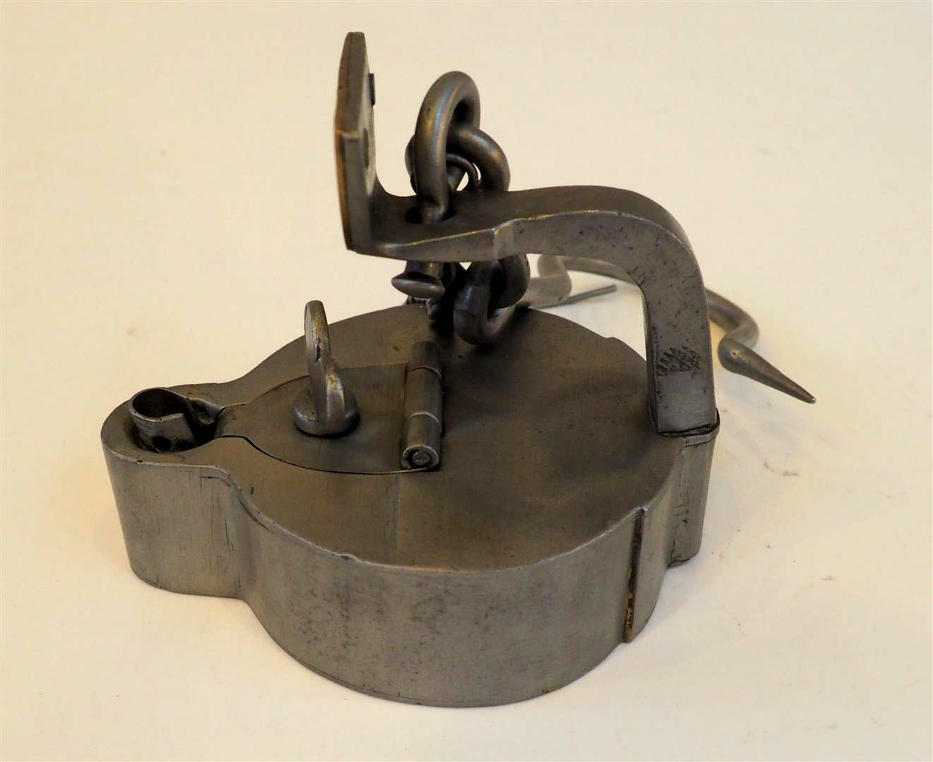 Eine Öllampe wie diese mit ihrer charakteristischen Form und dem typischen Haken gibt es in verschiedenen Ausführungen und Materialien. Mit ihrem Docht vorne und dem Griff an hinterem Ende erinnert sie an typische Darstellungen von Aladins Wunderlampe – doch Wünsche erfüllt sie leider keine. Die um 1900 hergestellten Leuchten fanden sich in vielen Haushalten Frankenthals und waren nützliche Helfer in mehrfacher Hinsicht. So erfüllten sie auch eine Schutzfunktion.