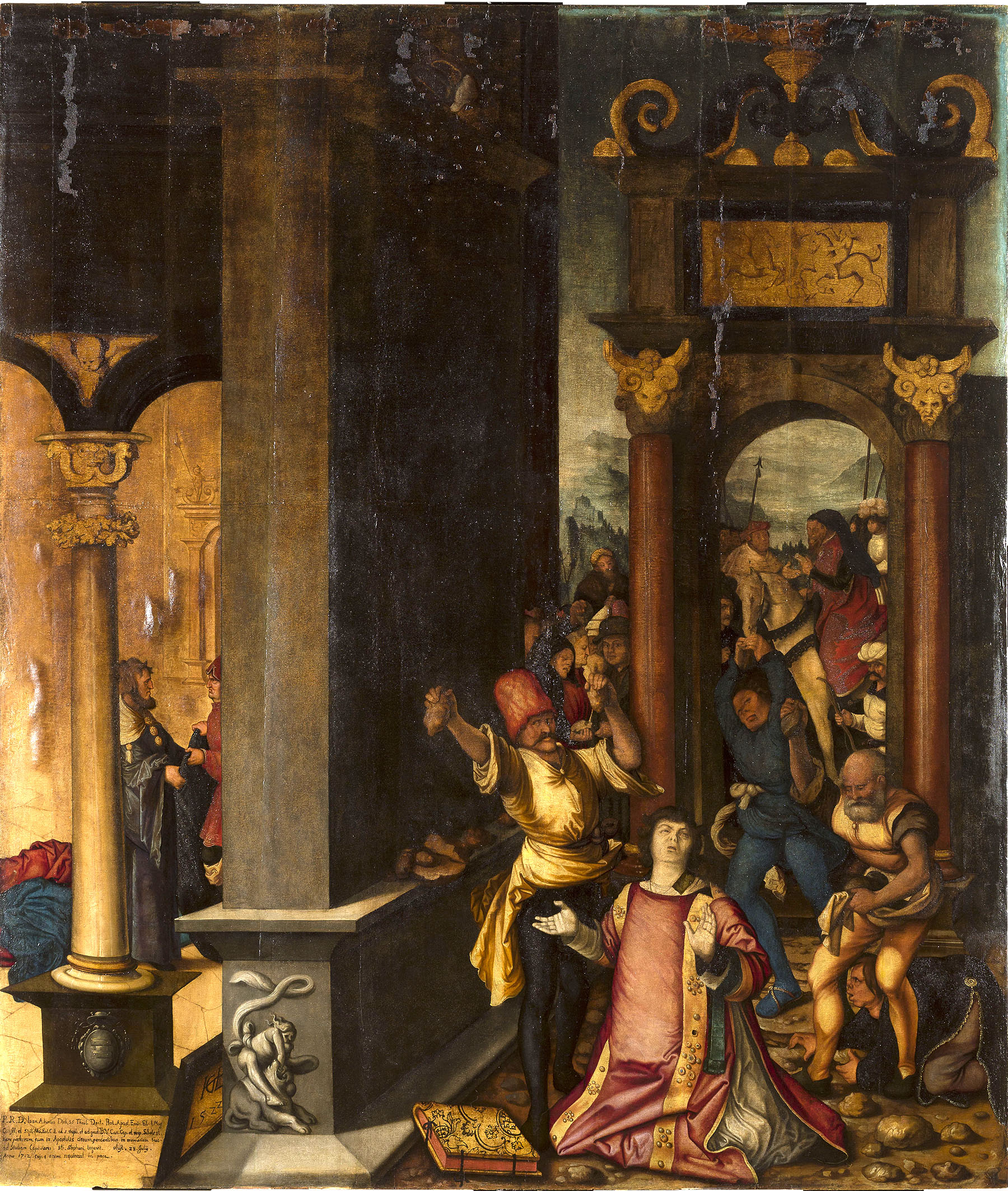Die Steinigung des heiligen Stephanus, 1522, mit Monogramm signiert und datiert, Öl auf marouflierter Leinwand auf Holz, 175 x 148 cm, Straßburg, Museum OEuvre Notre-Dame, Foto: Mathieu Bertola