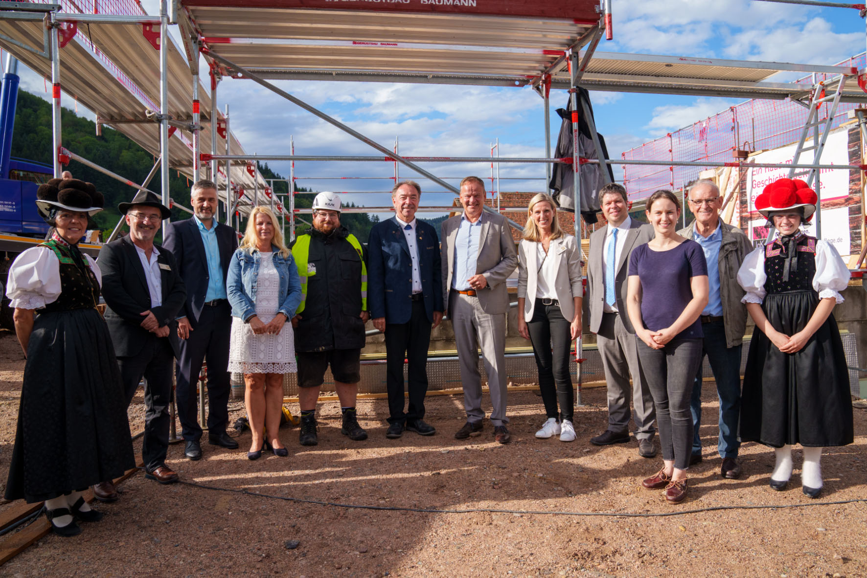 Grundsteinlegung des Ortenauhauses: Gemeinsam mit Landrat Frank Scherer (6. von rechts) begannen am 14. September die Bürgermeister von Gutach (6. von links) und Durbach (4. von rechts) die Grundsteinlegung des „Ortenauhauses“ im Freilichtmusem Vogtsbauernhof. Mit dabei waren auch die Besitzerfamilie Schmider/Bächle (2. und 3. von rechts), Finanzdezernentin Ulrike Karl (4. von links), Geschäftsführer der Firma JaKo Baudenkmalpflege GmbH, Bernd Jäger (3. von links), sowie die Museumsverantwortlichen Margit Langer (5. von rechts) und Thomas Hafen (2. von links). Foto: Schwarzwälder Freilichtmuseum Vogtsbauernhof, Benedikt Spether