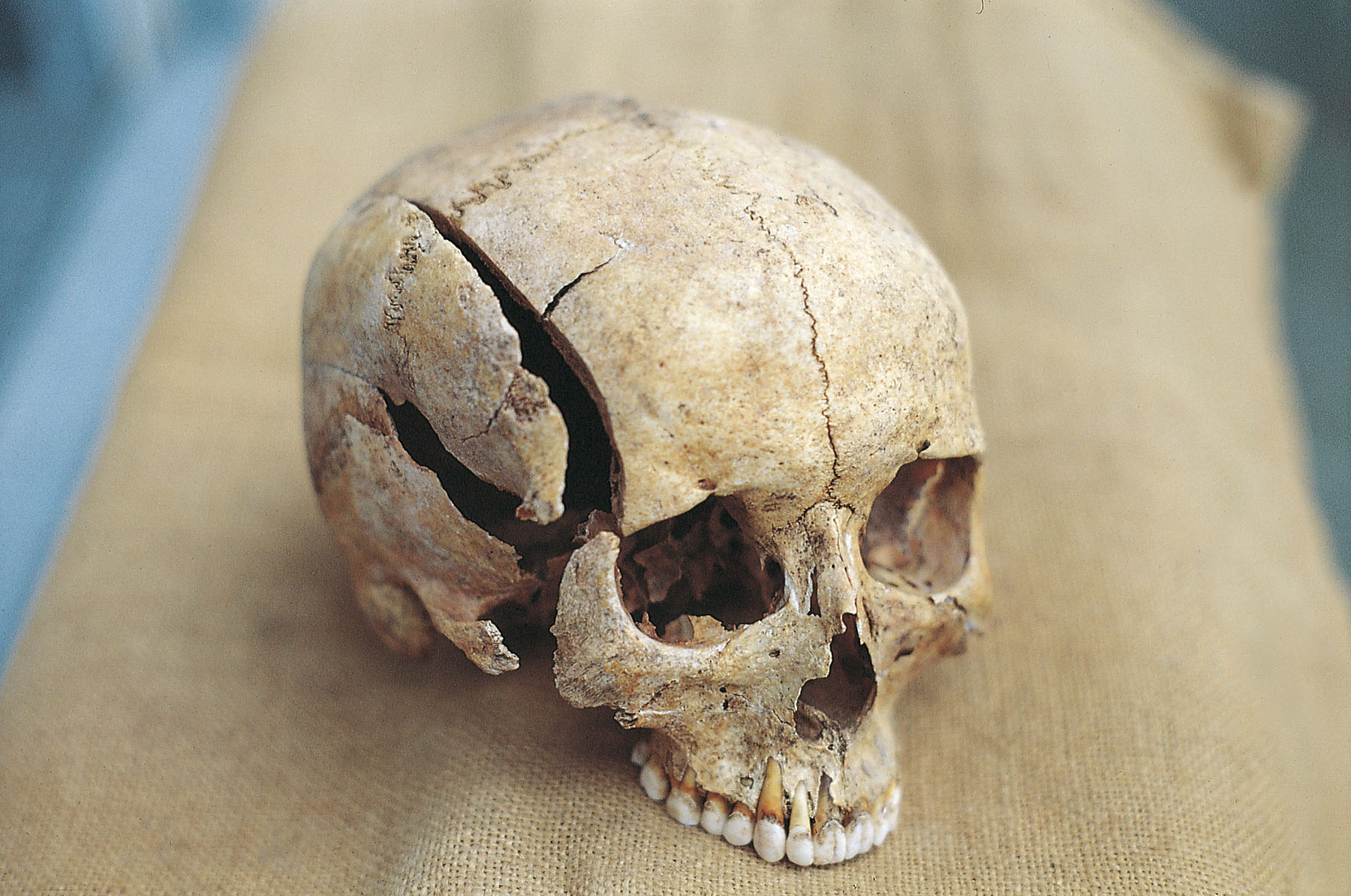 Ein gespaltener Schädel zeugt von einem gewaltsamen Tod. Foto: Joachim Wahl, Uni Tübingen
