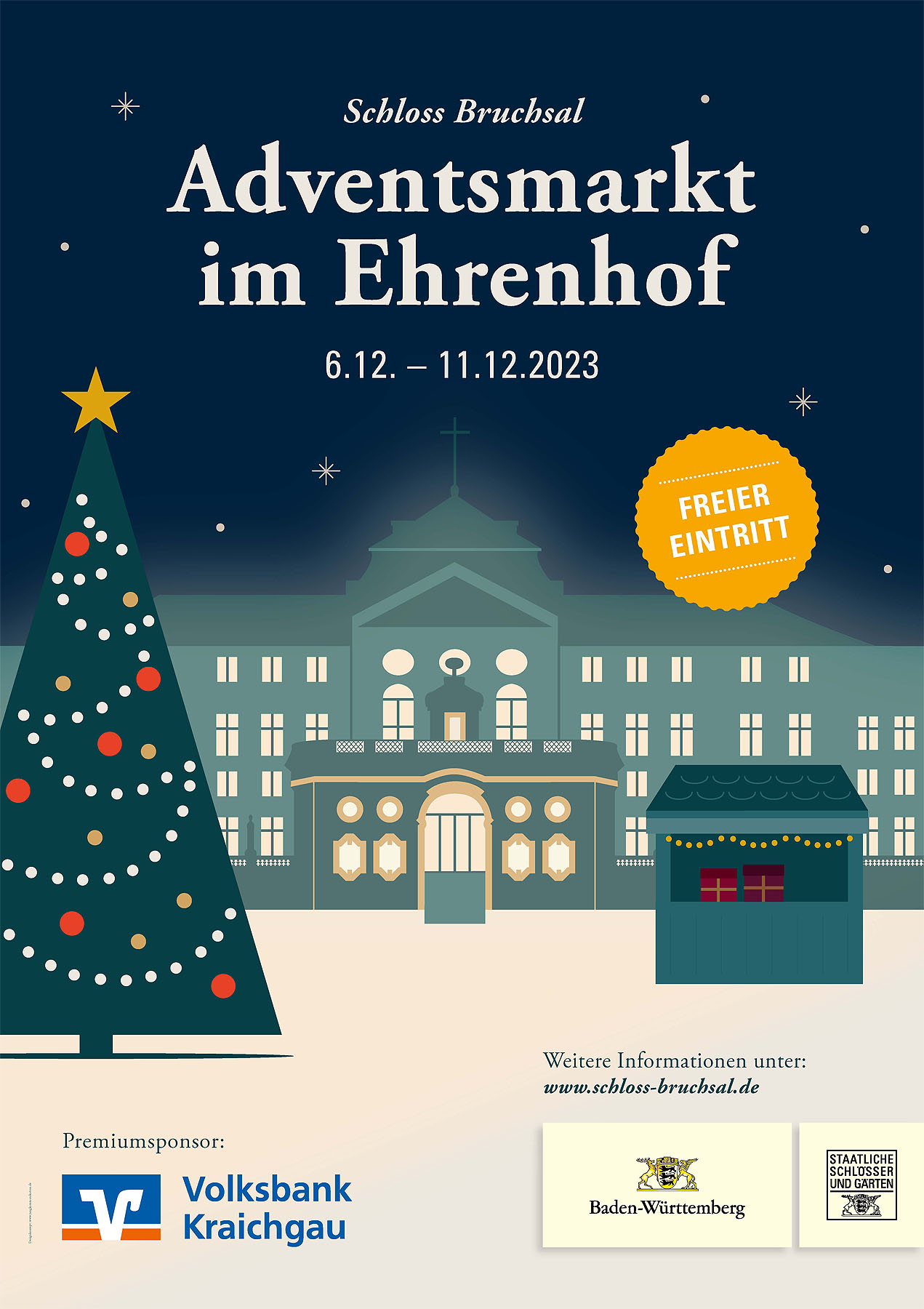 Zur schönsten Zeit des Jahres öffnen die Staatlichen Schlösser und Gärten die Tore von Schloss Bruchsal weit für alle, die einen Besuch auf dem Adventsmarkt mit einem Schlosserlebnis verbinden wollen. Die fürstbischöflichen Prunkräume, das Städtische Museum und das Deutsche Musikautomaten-Museum sind regulär geöffnet. Jeweils um 12.00 und 14.00 Uhr startet eine Schlossführung mit vielen Geschichten über das höfische Leben des 18. Jahrhunderts durch das Barockschloss. Außerdem stehen mehrere Sonderführungen auf dem Programm, bei denen die Gäste sich auf die Spuren der Weihnacht im Barockschloss begeben können. An allen Adventswochenenden findet zudem das traditionelle Adventssingen in der Intrada statt.