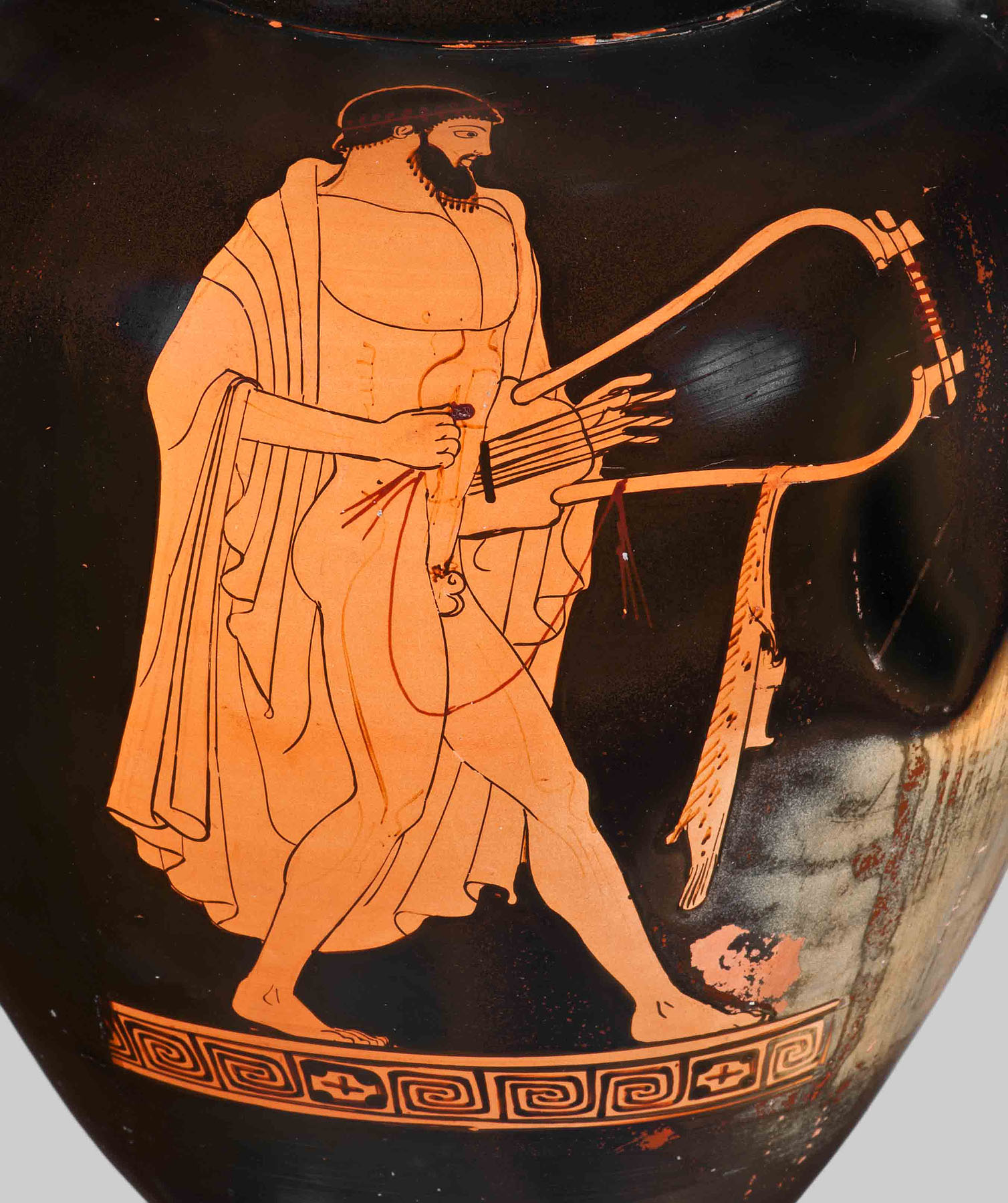 Unten: Nach dem Symposion ziehen die Teilnehmer musizierend und lärmend um die Häuser. Attisch rotfigurige Amphore, Ton, um 480 v. Chr. Staatliche Antikensammlungen München, Inv. SH 2339. © Staatliche Antikensammlungen und Glyptothek München, Renate Kühling
