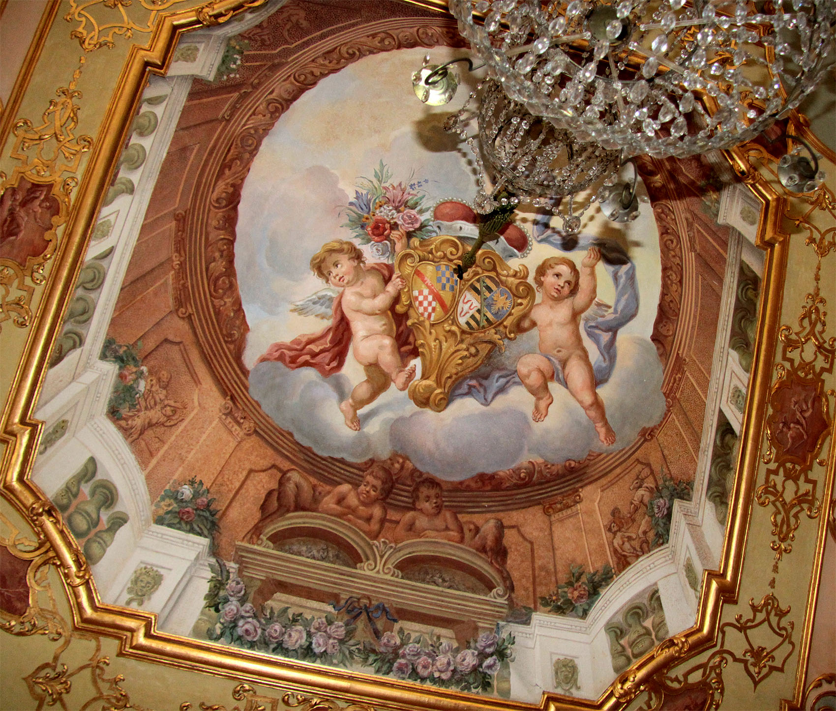 Schloss Favorite, Illusionistische Deckenmalerei mit dem markgräflich badischen und dem sachsen-lauenburgischen Allianzwappen.. Foto: kulturer.be
