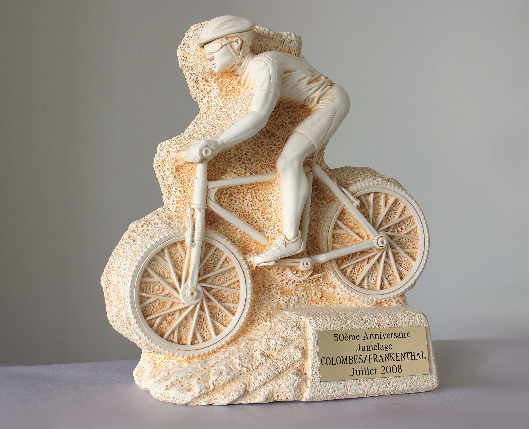 Bei dem Jubiläumsgeschenk handelt es sich um einen aus massivem Kalkstein gefertigten Reliefstein, der in seinen Gesamtmaßen 31 x 29 x 9 cm umfasst und die detaiillierte Profilansicht eines Radrennfahrers abbildet. Eine Messing-Plakette verweist auf das 50. Jubiläum der beiden Partnerstädte im Juli 2008. Überreicht wurde es von französischer Seite an das Kinder- und Jugendbüro der Stadt Frankenthal, das die Radtour als Teil der gemeinsamen Jubiläums-feierlichkeiten mitorganisiert hatte und an den Etappen auf deutscher Seite aktiv beteiligt war. Aus praktischen Gründen dürfte man die rund zwei zusätzlichen Kilogramm des Geschenks die 633 km lange Strecke wohl im eigenen Begleitfahrzeig transportiert haben, das den Jugendlichen aus Sicherheits- und Versorgungsgründen zur Seite stand.