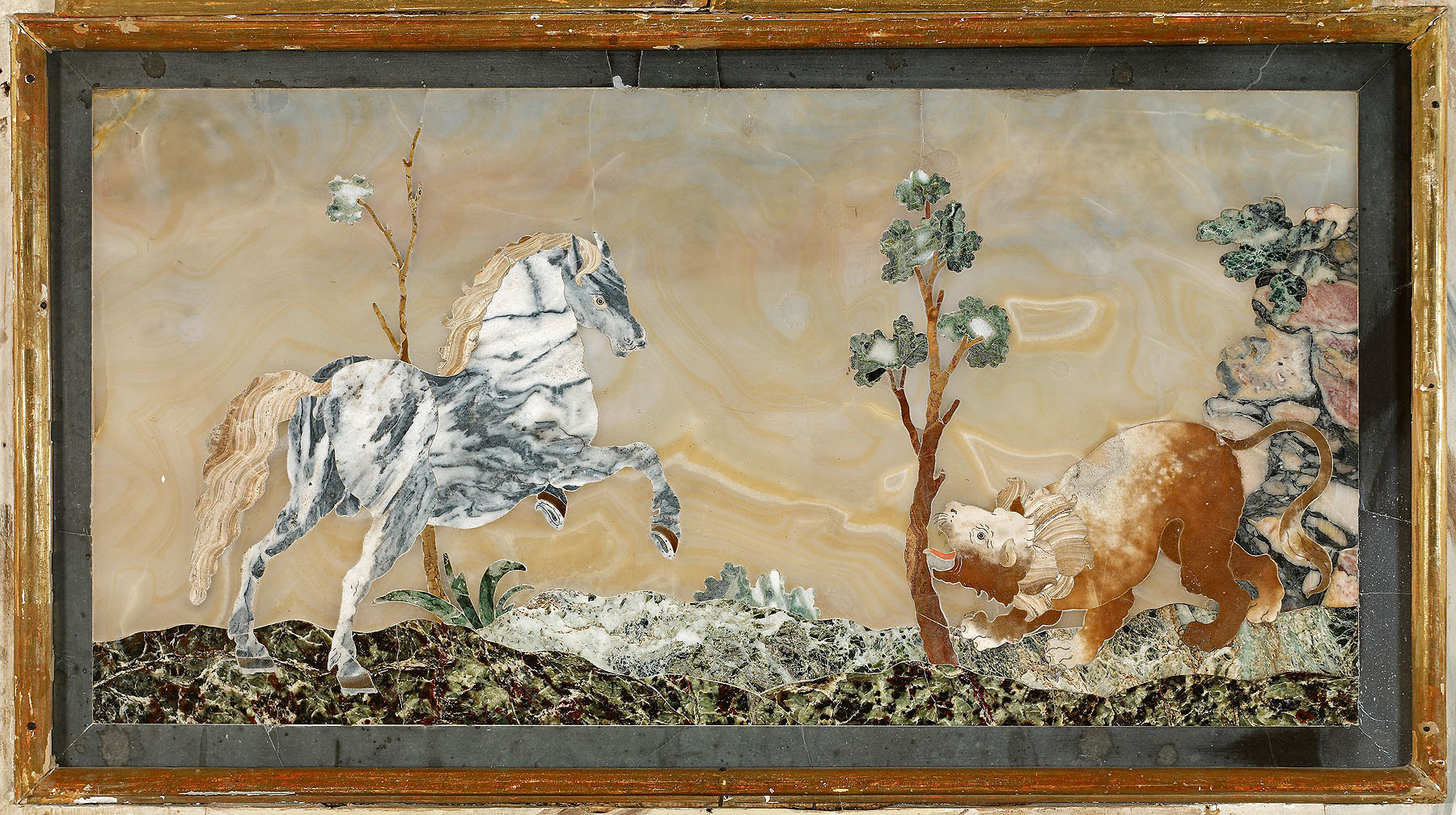 Die Räume im Schloss Favorite überwältigen durch ihren barocken Reichtum. Einer der Höhepunkte ist das sogenannte Florentiner Kabinett: Hier ließ die fürstliche Sammlerin Sibylla Augusta die Wände mit feinen Einlegearbeiten aus Halbedelsteinen schmücken. 758 Bildtafeln verleihen dem kleinen Raum seine ganz besondere Atmosphäre. Die Pietra-Dura-Tafeln stammen aus den Hofwerkstätten der Familie Medici in Florenz. Auf zweien kann man die afrikanische Großkatze entdecken: Eine der Tafeln zeigt eine kurz vor dem Kampf stehende Szene zwischen einem Pferdeschimmel und einem brüllenden Löwen. Auf einer weiteren Tafel präsentiert sich ein Löwe im stolzen Gang über dem Abbild eines Zentauren.