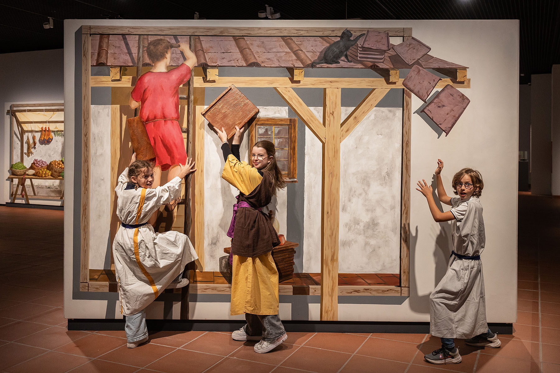 Neben dem außergewöhnlichen Foto-Spaß gibt es passende Fundstücke aus der Römerzeit, Experten-Videos sowie zahlreiche Mitmach-Stationen. An einer Verkleide-Station erleben die Besucherinnen und Besucher beispielsweise römische Mode hautnah und schlüpfen in Tunika und Toga oder die Uniform eines Legionärs. Sie probieren Brettspiele aus, mit denen sich schon die Römer die Zeit vertrieben haben. Beim Legen eines Mosaiks ist künstlerisches Talent gefragt und beim Straßen- und Hausbau handwerkliches Geschick.