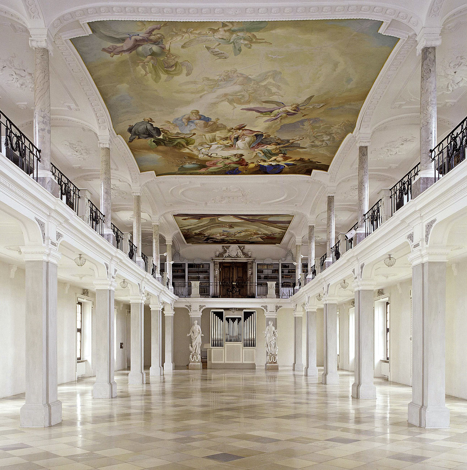 Das Kloster Wiblingen, südlich vor Ulm gelegen, ist bekannt für seinen malerischen Bibliothekssaal – er gilt als eine der wohl gelungensten Raumschöpfungen des Rokoko. Der Raum ist kein schlichter Aufbewahrungsort für Bücher, sondern ein Festsaal „für alle Schätze der Weisheit und Wissenschaft“. Die rhythmisch geschwungene Galerie, das reiche Figurenprogramm und das monumentale Deckenfresko sollten beeindrucken. Wissen und Glaube standen hier unübersehbar im Mittelpunkt. In der Blütezeit der Bibliothek beherbergte Wiblingen rund 15.000 Bände – und damit mehr als so manche Universität der damaligen Zeit. Die Bücher mussten sich in das Gesamtkonzept des Raums fügen: Daher wurden ihre Buchrücken weiß angestrichen oder mit hellem Papier beklebt. Nach der Säkularisation zu Beginn des 19. Jahrhunderts wurde die Büchersammlung zerstreut. Die unvergleichlich heitere Atmosphäre blieb jedoch ungebrochen.