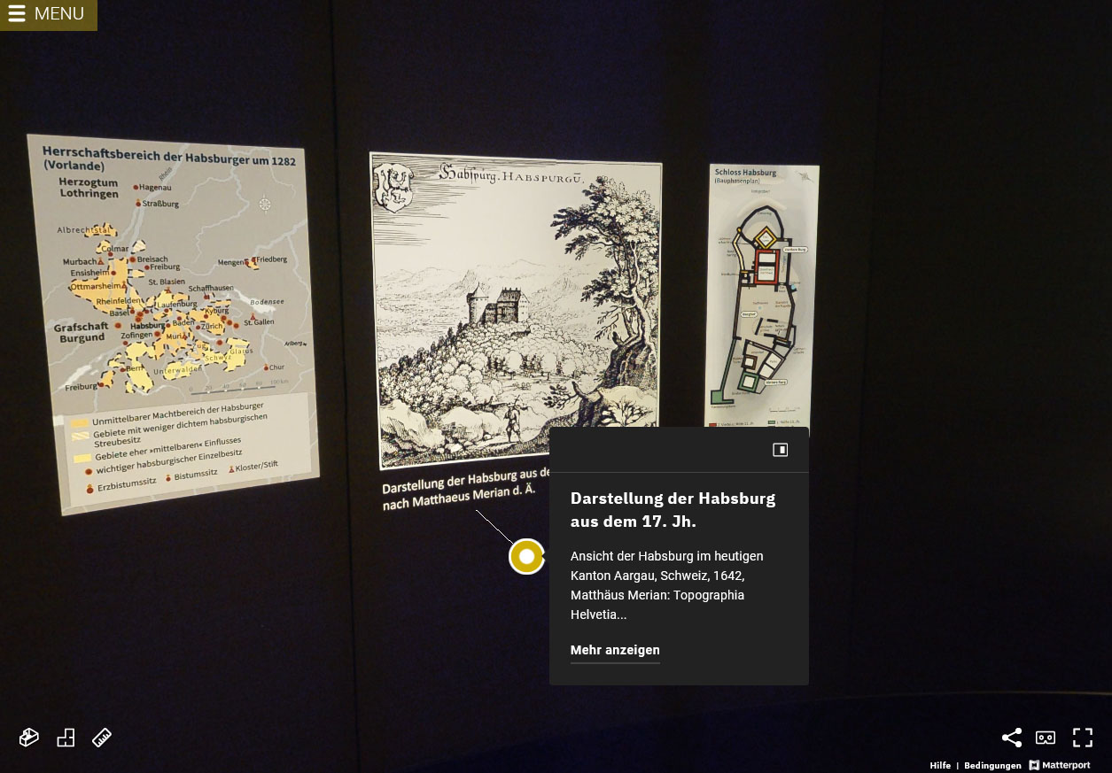 Blick in die digitale Ausstellung mit einer Darstellung der Burg Habsburg aus dem 17. Jahrhundert. Screenshot. Bild: HMP/kulturer.be
