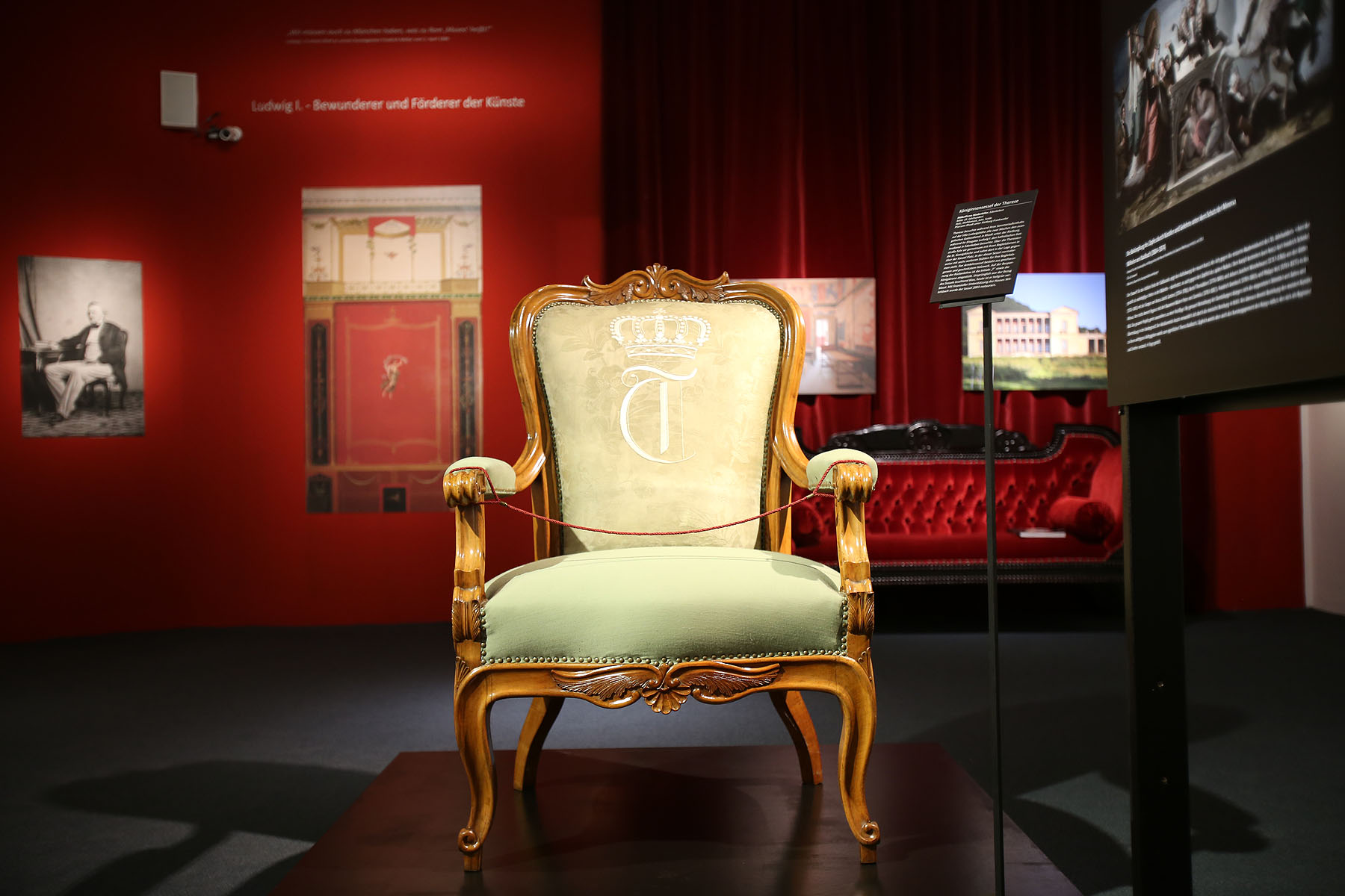 Es ist eines der Objekte in der Ausstellung, das von den zahlreichen Besuchen des Königpaares in der Pfalz zeugt. König Ludwig I. und Therese ließen sich 1852 bei Edenkoben die Villa Ludwigshöhe als Sommerresidenz errichten. Während ihrer Aufenthalte dort besuchte Königin Therese alle zwei Wochen den Gottesdienst in der evangelischen Sankt Georgskirche in Rhodt. In der Kirche war eigens für sie eine Loge eingerichtet worden. Dort stand ihr persönlicher Sessel mit eingestickter Initiale „T“ und einer Königskrone.
