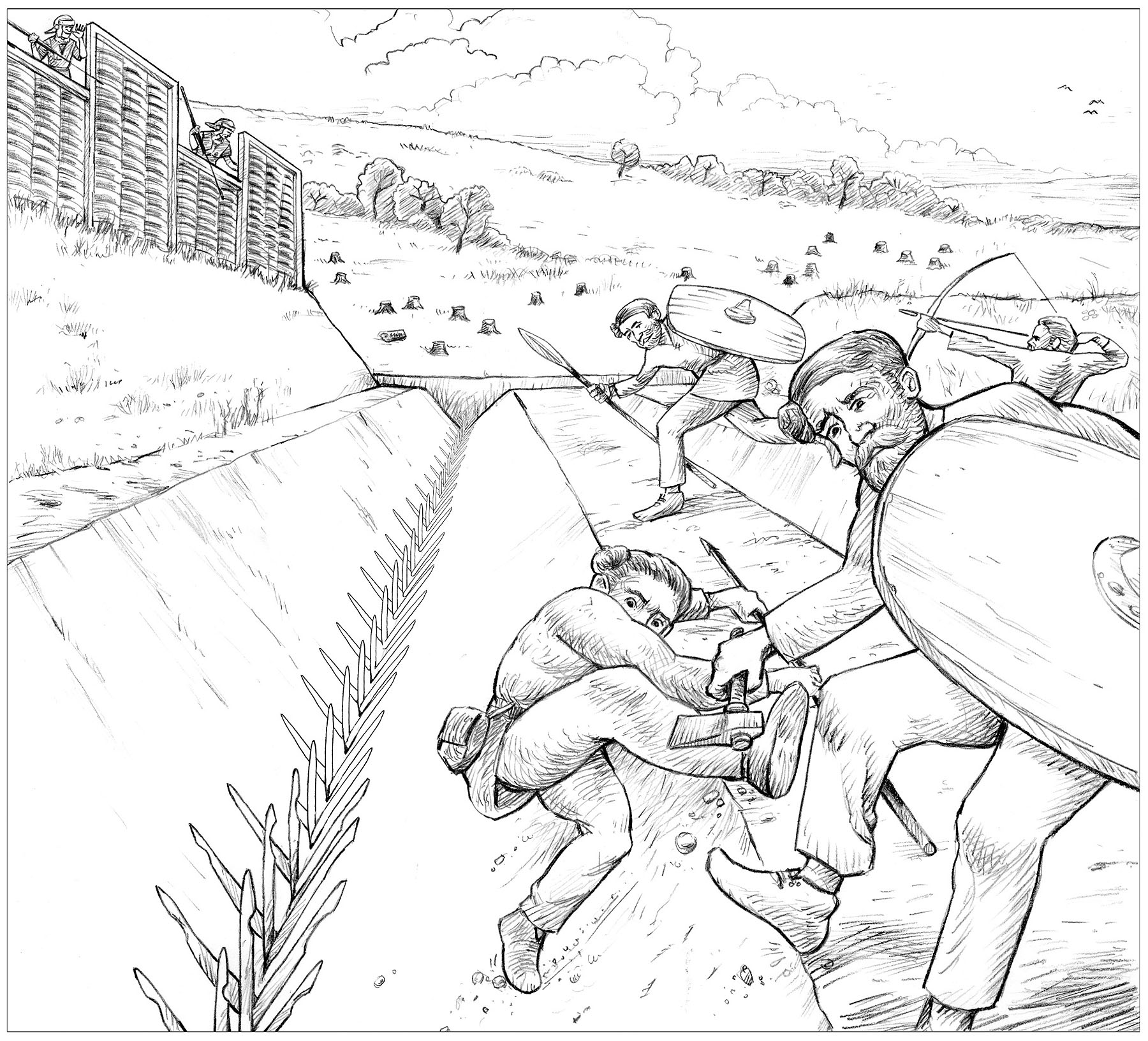 „Im inneren Spitzgraben des Kleinkastells haben wir die angespitzten Holzpfähle in einem Verteidigungssystem gefunden. Bemerkenswert ist, dass die Funde in ihrem ursprünglichen funktionalen Konstruktionskontext erhalten geblieben sind. Die außergewöhnlich gute Erhaltung der Holzobjekte und die sehr gut erhaltenen und geborgenen Stoffreste aus dieser Zeit sind vor allem der dauerhaften Staunässe zu verdanken. Solche Annäherungshindernisse wurden bereits von antiken Autoren wie Caesar beschrieben, aber erstmals gelang hier im gesamten Römischen Reich der archäologische Nachweis solcher pila fossata“, so beschreibt der Archäologe Prof. Dr. Markus Scholz von der Goethe-Universität Frankfurt a.M. die Fundsituation.