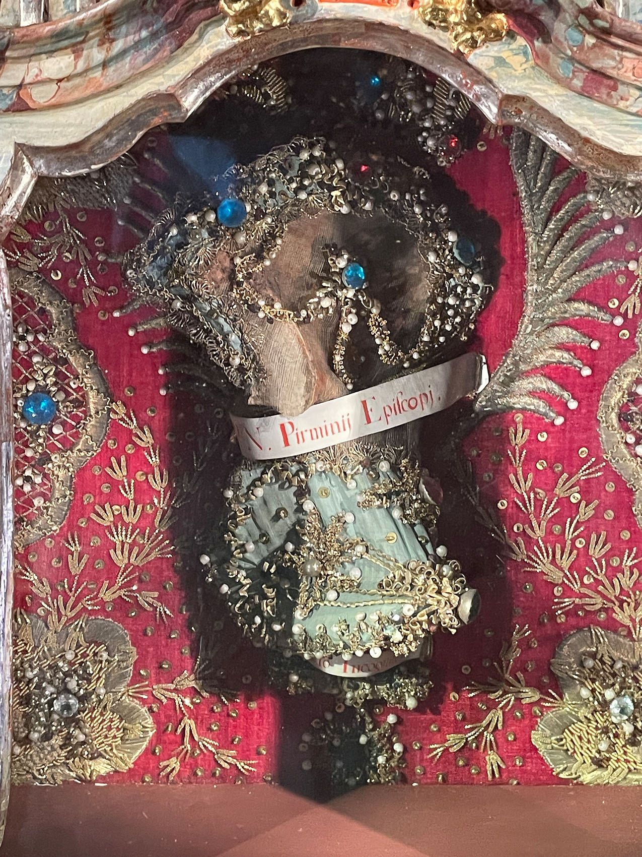 Beckenknochen des Heiligen Pirmin aus dem ehem. Kloster Pfäfers (Kanton St. Gallen). Unbekannter Künstler, um 1725. Pfäfers, Kathol. Kirchengemeinde.