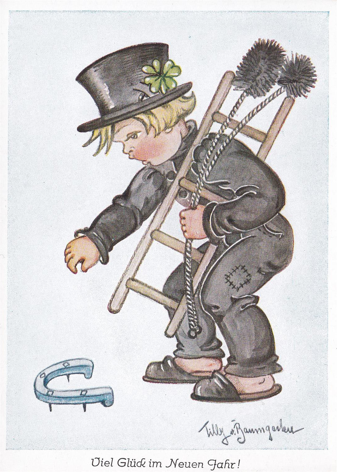 Glück- und Gesundheitswünsche sind ein fester Bestandteil der Neujahrstradition. Dies trifft auch auf Glücksbringer wie Glücksschweine, vierblättrige Kleeblätter, Hufeisen, Marienkäfer oder Schornsteinfeger zu, die beispielsweise in Marzipan gefertigt beliebte Geschenke darstellen. In der Sammlung des Erkenbert-Museums befinden sich verschiedene Postkarten mit Neujahrsmotiven aus den 1920er und 1940er Jahren. Neben klassischen Motiven wie Schornsteinfeger, die durch das regelmäßige Reinigen des Schornsteins „Glück“ in das Haus bringen, und vierblättrige Kleeblätter, die mit dem Paradies assoziiert werden, finden sich auch heute weniger verbreitete Glücksbringer wie Mistelzweige auf den Postkarten.