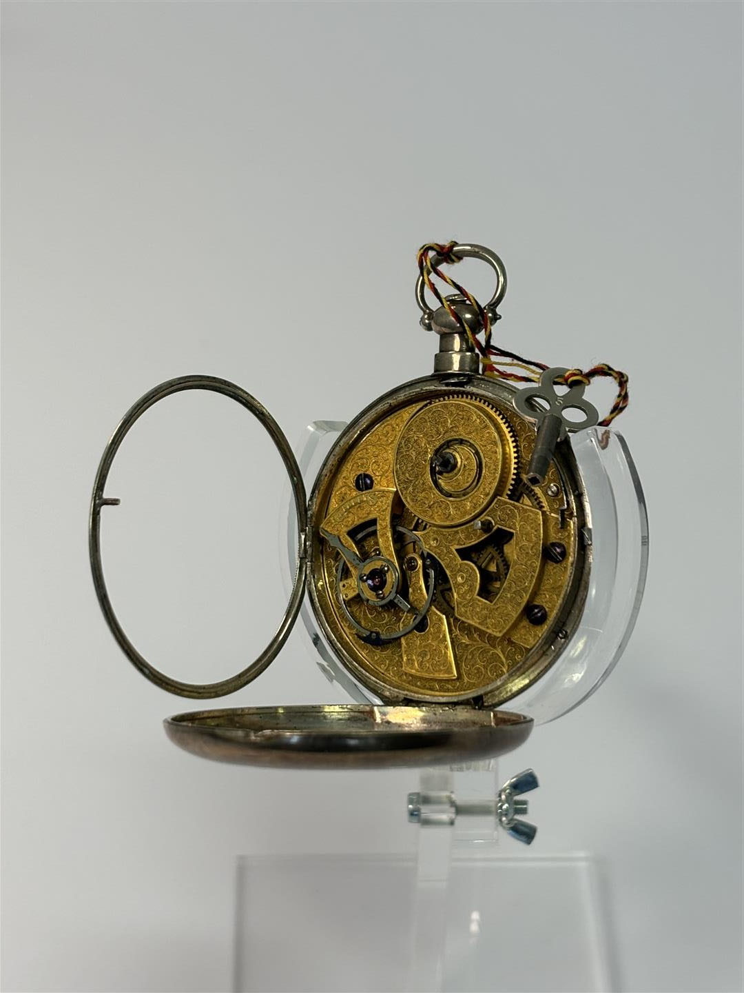 Die silberne Taschenuhr im Lépine-Kaliber mit emailliertem weißem Ziffernblatt und Schlüsselaufzug auf der Rückseite entstand vermutlich zwischen 1880 und 1889. Durch das Öffnen der Uhr wird das reich geschmückte und kunstvolle ornamentierte Werk sichtbar, welches ursprünglich von einem heute fehlenden Deckglas geschützt wurde. Das Zeigerpaar mit Sekundenzeiger ist ebenfalls nicht mehr vorhanden. Das Werk wurde vermutlich in der Schweiz für den Export hergestellt, worauf die Markierungen „S“ und „F“ (für engl. slow und fast) am Rücker hinweisen. Ein chinesisches Schriftzeichen im Zentrum des Deckels legt die Vermutung nahe, dass die Uhr für den chinesischen Markt bestimmt war. Der Hersteller bleibt jedoch unbekannt.