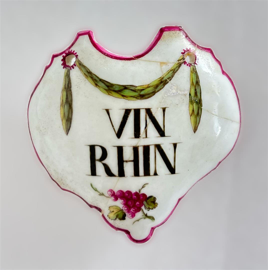 Die vermutlich im 19. Jahrhundert entstandenen Weinflaschenschilder aus Porzellan und Fayence dienten nicht nur der Kennzeichnung des Weins, sondern erfüllten auch eine dekorative Funktion. Sie verfügten ursprünglich über Metallketten, welche um den Hals der mit dem entsprechenden Wein gefüllten Weinkaraffe gehängt wurden. Die tragen französische Weinnamen, wie „Vin Rhin“, „Vin de Tokay“ oder „Vin de St. Couleur de Rose“ und könnten auf einen französischen Ursprung der Schilder verweisen.