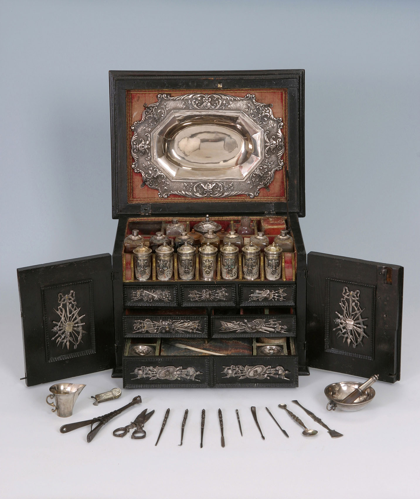 Kostbare Reiseapotheke, um 1640, mit silberner Aderlass-Schale im Deckel, um 1640, © Dt. Apotheken Museum-Stiftung, Heidelberg. Foto: Claudia Schäfer
