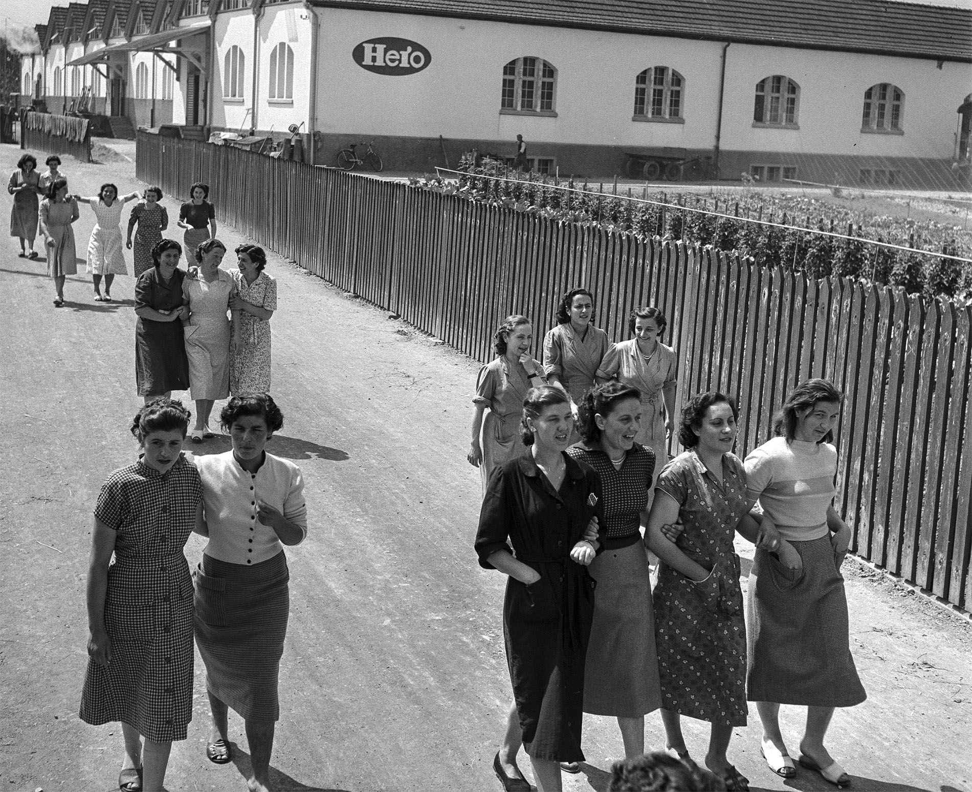 Mode aus Italien wird bald zum Synonym für Qualität und Stil. Nicht nur grosse Modehäuser tragen zu ihrer Verbreitung bei, auch Migrantinnen und Migranten prägen die Mode in der Schweiz mit ihrem Bewusstsein für ausgewählte Kleidung nachhaltig. Fabrikarbeiterinnen aus Italien vor der Konservenfabrik Hero. Frauenfeld / TG, 1952. © Photopress-Archiv, Zust, Keystone