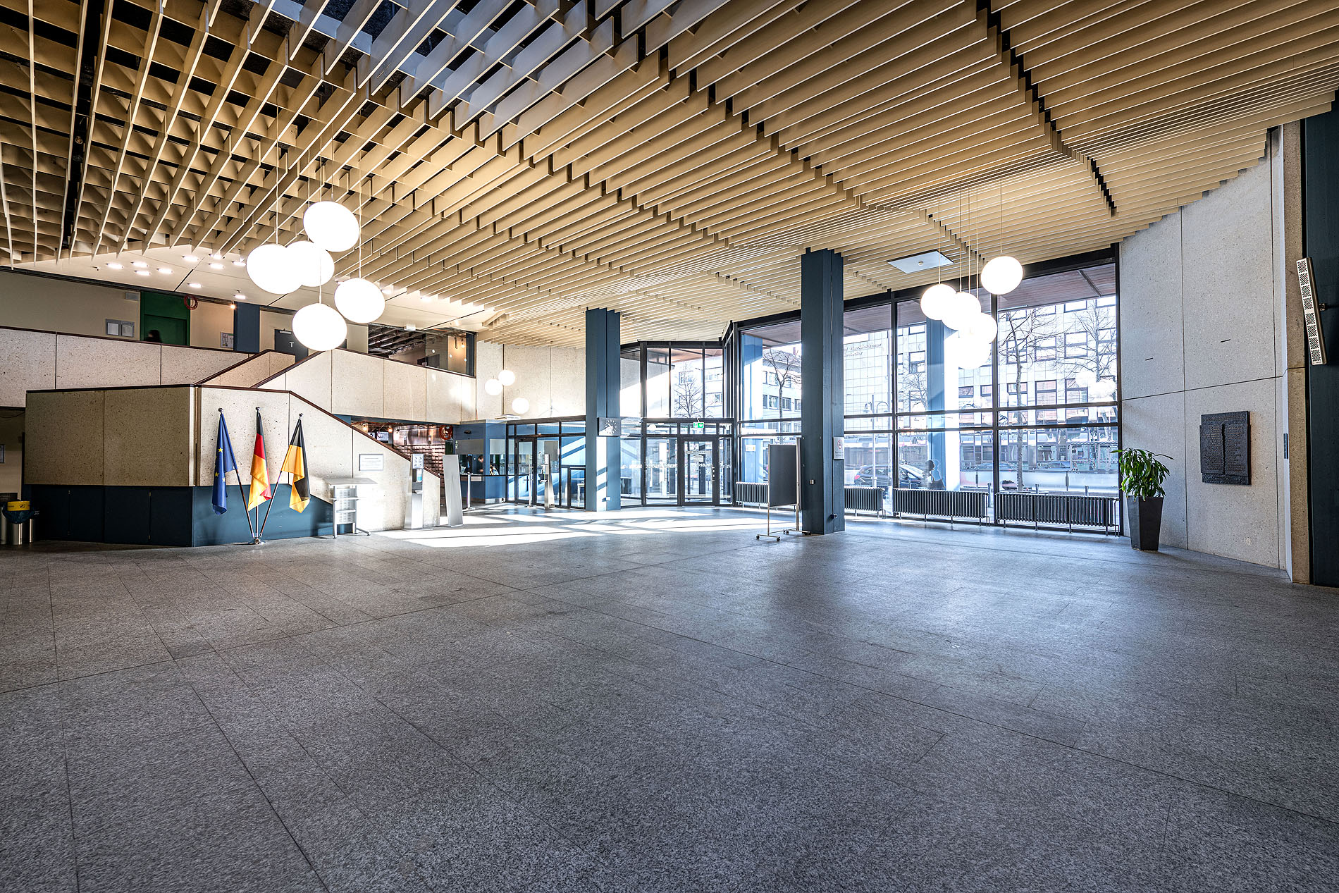 Trotz der introvertierten Aura signalisiert eine große verglaste Eingangsnische die prinzipielle Öffentlichkeit des Gebäudes. Das weiträumige Foyer bietet den Eintretenden unmittelbar einen Überblick über die Verhandlungssäle und ausreichenden Raum für Kommunikation oder Rückzug. Kontemplation ermöglicht der „Bilderbaum“ des Künstlers Hubertus von Pilgrim, 29 Kupfertafeln mit Einätzungen nach Kupferstich- und Fotovorlagen, die existentielle Erfahrungen des Menschen in unterschiedlichen Facetten darstellen.