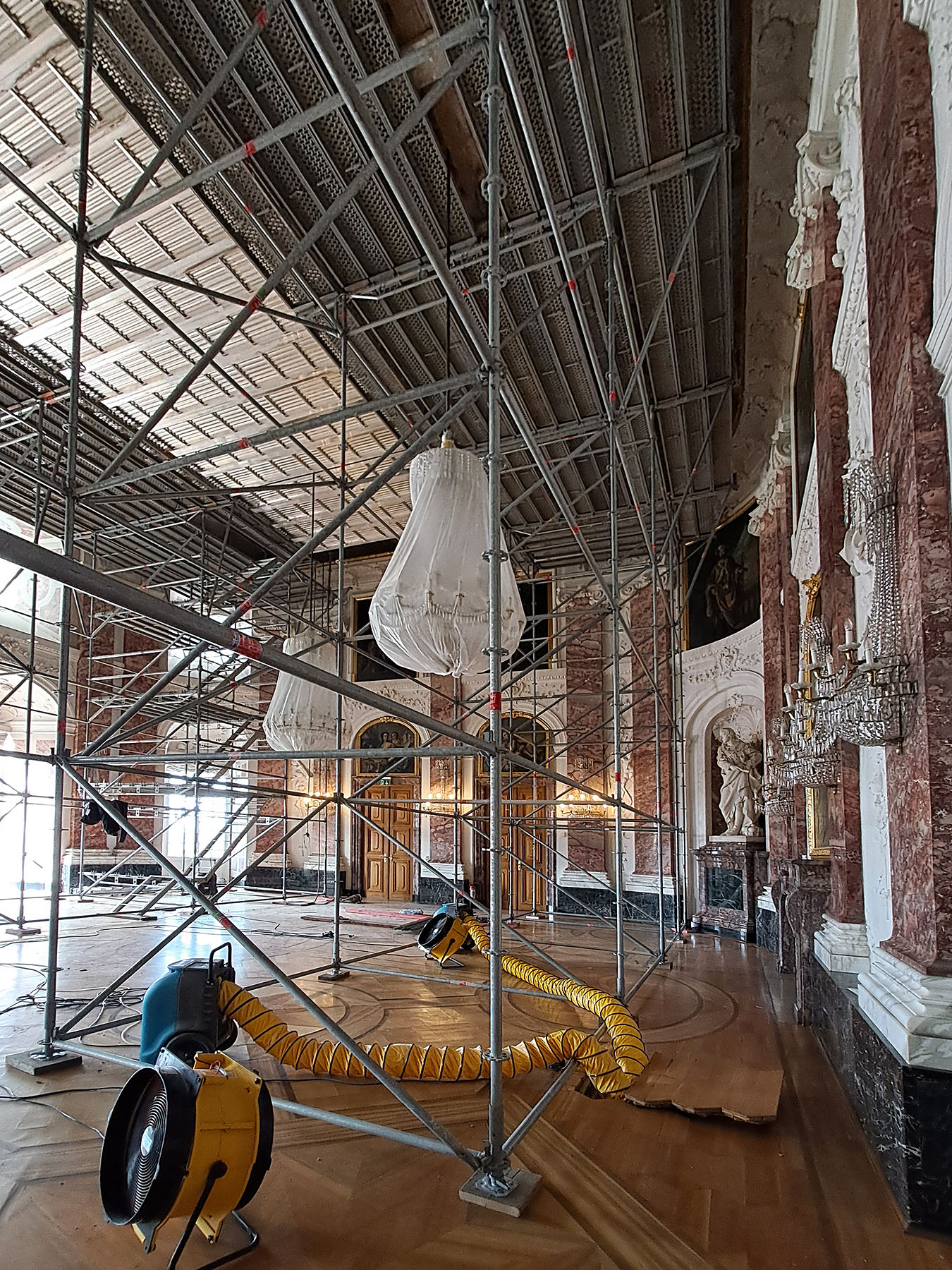 „Die vergangenen zehn Monate musste der Rittersaal geschlossen bleiben“, sagt Frank Krawczyk, Leiter Bereich Kommunikation und Marketing der Staatlichen Schlösser und Gärten. „Umso mehr freut es uns, dass der Rittersaal dank professioneller Zusammenarbeit aller Beteiligten nun wieder zugänglich ist.“ Die Sanierung stellte die Expertinnen und Experten vor außergewöhnliche Herausforderungen: Nach dem Wasserschaden durch eine ausgelöste Sprinkleranlage musste vor allem der historische Parkettboden aufwendig restauriert werden. In präziser Handarbeit wurde an über 20.000 Stellen Leim injiziert, um den Boden zu stabilisieren. Das Ergebnis kann sich sehen lassen: Die nun unversiegelte Oberfläche zeigt die historischen Holzstrukturen und Ornamente in bisher nicht gekannter Deutlichkeit.