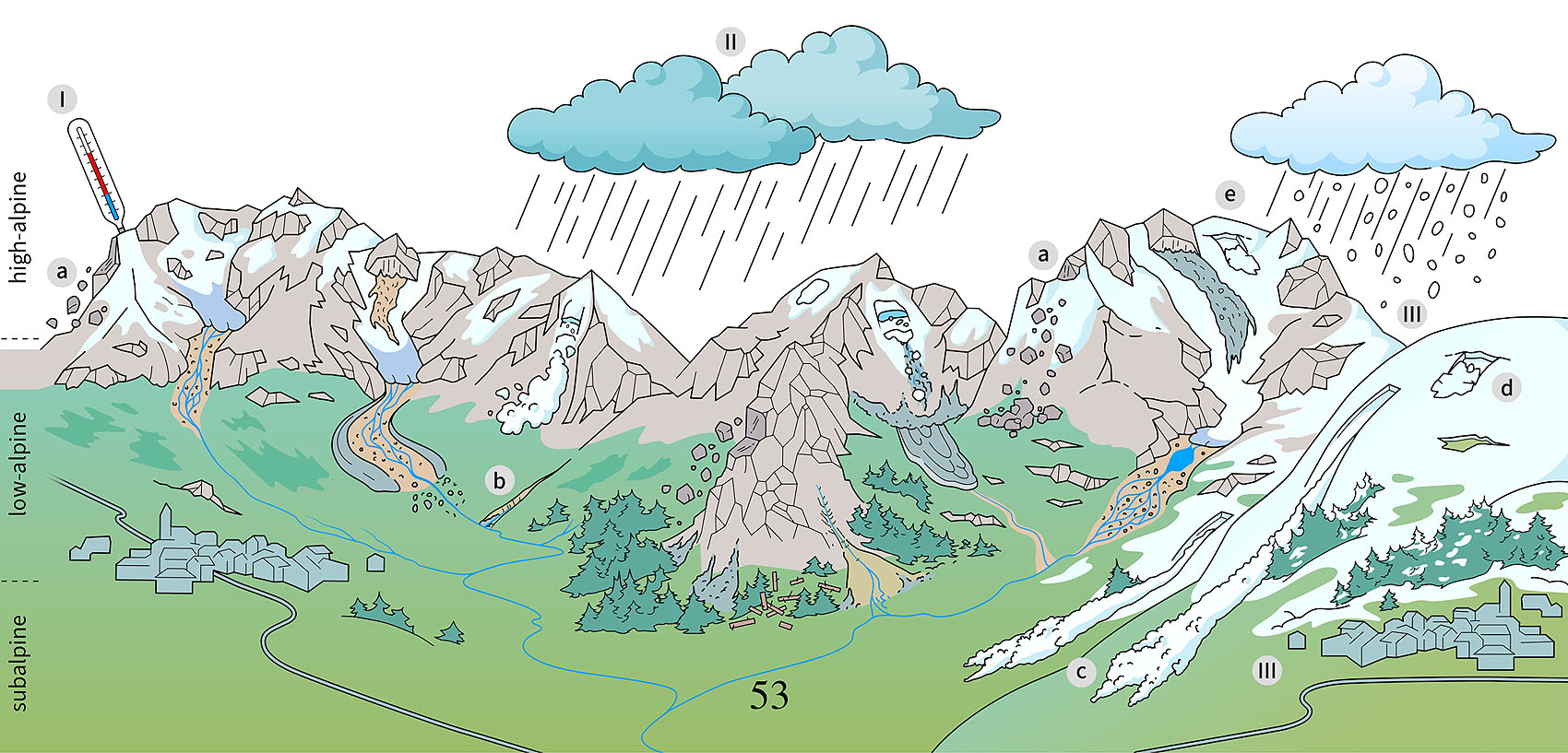 Steigende Temperaturen (I) sind die Hauptursache, dass sich die alpinen Gefahren wie Steinschläge (a), Murgänge (b) und Lawinen (d-e) verändern. Grafik: Jacquemart, Weber et al. (CC-BY).