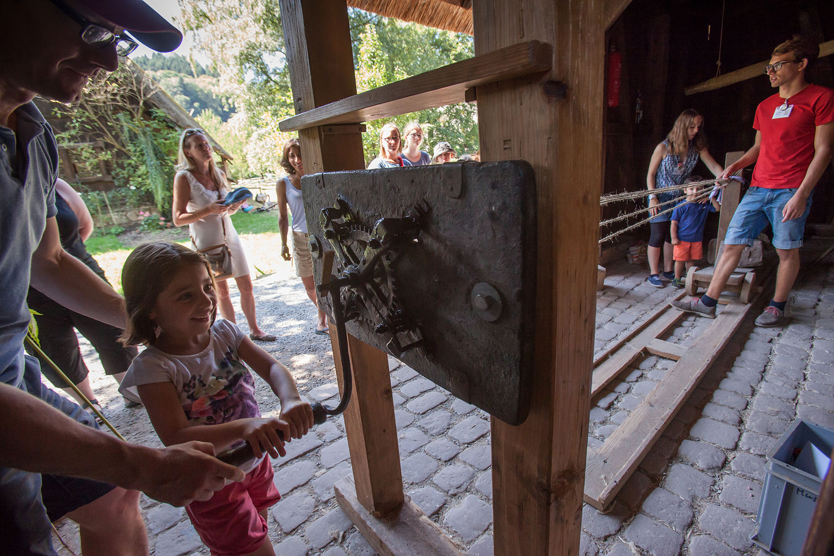 Den ganzen Tag über warten zahlreiche Vorführungen und Mitmachaktionen auf die Besucher. Auf dem Holzplatz können Groß und Klein selbst Hand anlegen und Holz spalten, Schindeln ziehen oder sägen. Mit Webmeisterin Gabriela Martin entstehen farbenfrohe Freundschaftsbänder. In der Offenen Werkstatt für Familien drehen Kinder von 11 bis 16 Uhr nach alter Technik Seile, bauen Kreisel oder bedrucken T-Shirts.