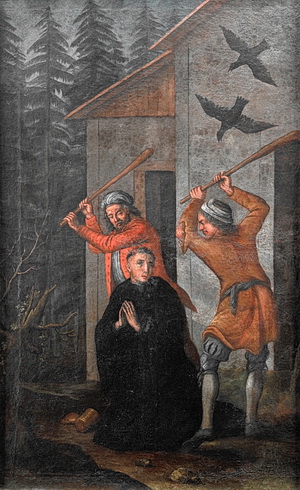 oben: Meinrad wird von zwei Räubern ermordet. Öl auf Leinwand. Zweite Hälfte des 17. Jahrhunderts. Kloster Einsiedeln, Kunstsammlung. Foto: Schweizerisches Nationalmuseum