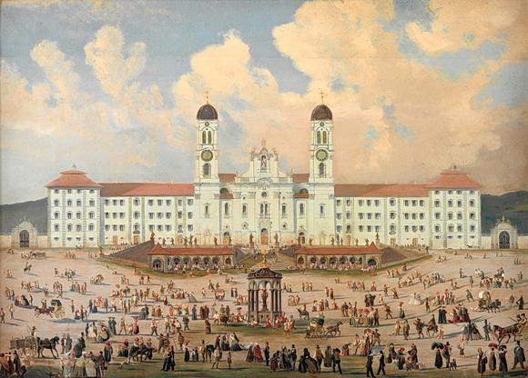 unten: Das Kloster Einsiedeln um 1840/1850. Öl auf Holz. Kloster Einsiedeln, Kunstsammlung. Foto: Schweizerisches Nationalmuseum