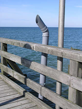 Installation "Wellenschlagen" auf der Seebrücke: Rohre reichen bis an die Wasseroberfläche und leiuten den Wellenschlag an das Ohr des Lauschenden.