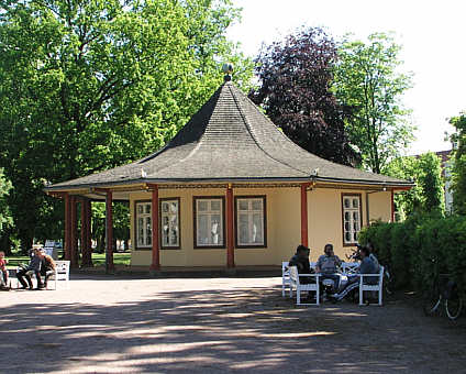 Achteckiger Fackwerkbau mit Säulenumgang, mit Pagodendach als späte Chinoiserie in Mecklenburg, C. T. Severin, 1808/09. heute Austellungsraum des Stadtmuseums. Daneben "weißer Pavillon" als Café.