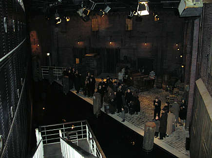 Am Kai. Wartende Menschen mit Gepäck, gesehen vom oberen Ende der Gangway aus. Rechts die hoch aufragende Seite des Auswandererschiffs.