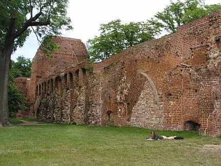 Konventsgebäude, Westwand mit Ansatz der Kreuzgangswölbung. Im Hintergrund die Wand zwischen Querhaus der Klosterkirche und Sakristei.