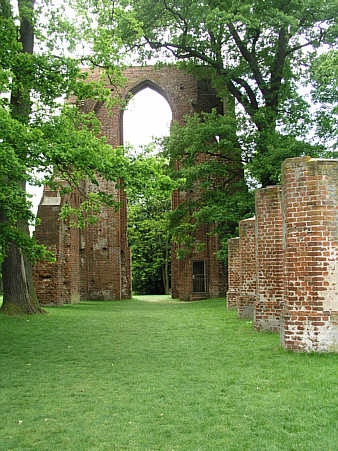 Blick aus dem ehem. Kirchenschiff (dreischiffig, in neun Jochen) an den Resten der Mittelschiffpfeiler vorbei nach Westen auf die Innenseite der Westfront (Anfang 14. Jh.).