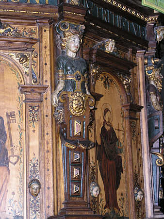 Kanzelkorb: Herme zwischen den Intarisenbildern von Christus und Petrus.