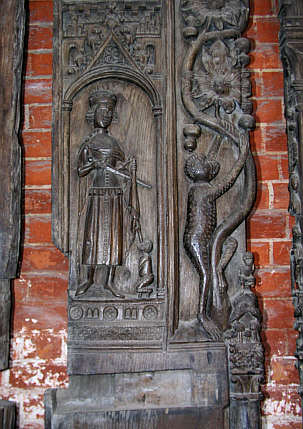 Chorgestühlwangen, 15. Jh., aus St. Georgen Detail: St. Martin (links) und kletternder Affe (rechts)
