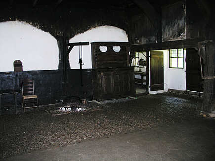 Diele des Heuerhauses mit der offenen Herdstelle und dem Kran für den Kochtopf. Die Türen (je eine links und eine rechts) führen in die beiden Wohnkammern mit Alkoven. Die Arbeitskammern liegen rechts undlinks auf der Innenseite der Lucht.