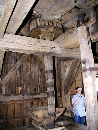 Antriebswelle für den Mühlstein, vom Haupt-Zahnkranz (Stirnrad) angetrieben. Unten der Mahlgang mit dem Einfülltrichter für das Mahlgut.