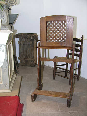 Beichstuhl, bestehend aus einem einfachen Sichtschutz, dahinter ein alter Opferstock.