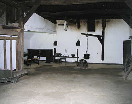 Blick von der Diele in das Flett mit der einseitigen Lucht. Die Herdwand (mit dem Kran für den Topf) ist zugleich Rückwand des Hauses.