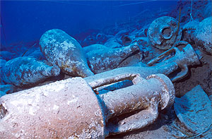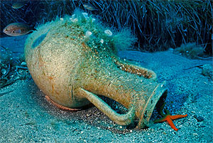 Oben: Amphoren des römischen Schiffes aus spätrepublikanischer Zeit vor der Cala Minnola auf Levanzo. Soprintendenza del Mare, Regione Siciliana, Palermo.
