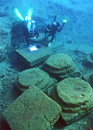 Links: Basen römischer Säulen im Hafen von Sottomonastero auf Lipari. Soprintendenza del Mare, Regione Siciliana, Palermo.